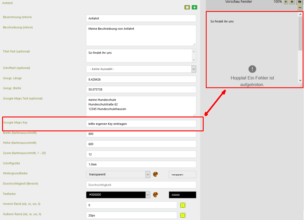 - Google-Maps Key: Gültiger Google-Maps Key, den sie bei Google beantragen können