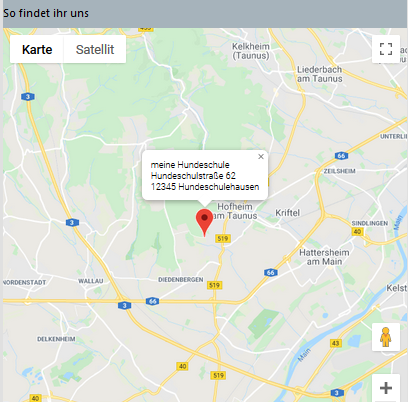 Mit dem Anfahrt Inhalts Element können sie ihren Homepage Besuchern zeigen, wie sie zu finden sind, wo ihr Trainingsgelände ist, wohin es in den nächsten Hundeschul-Ferien geht oder wo Treffpunkte sind.