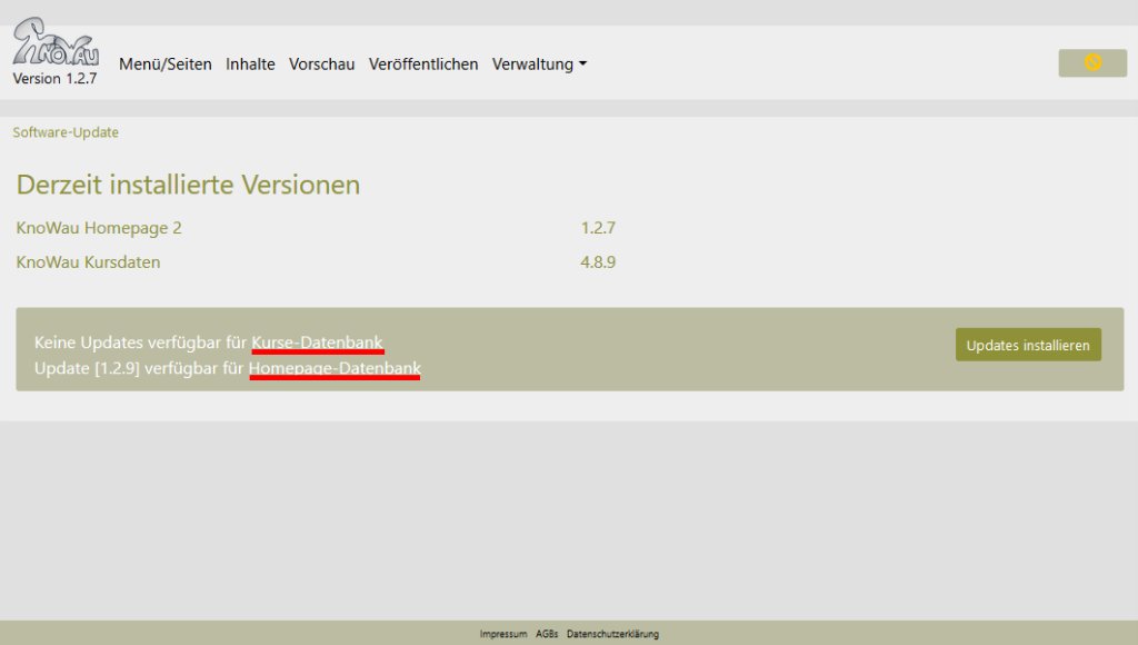 Für den KnoWau Homepage Modul gibt es einen eigenen Update-Server, auf dem wir von Zeit zu Zeit Updates veröffentlichen. Ob ein Update verfügbar ist, erfährt man im Dialog Verwaltung->Auf Updates prüfen.