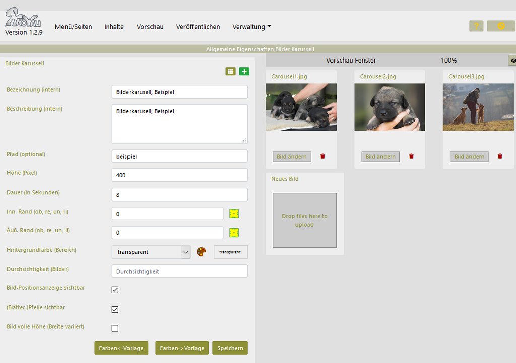 Ein Bilderkarussell zeigt eine automatisch wechselnde Serie von Bildern. Es kann mehrere Bilder enthalten. Die Bilder werden zentriert und skaliert angezeigt, sodass bei höheren Bildformaten nur ein passender mittlerer Streifen sichtbar ist. Dauer und Höhe des Bilderkarussells können sie einstellen.