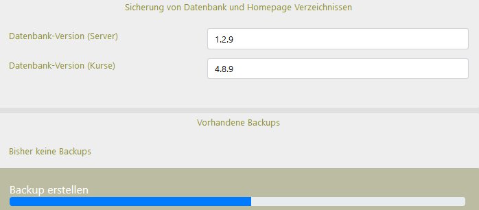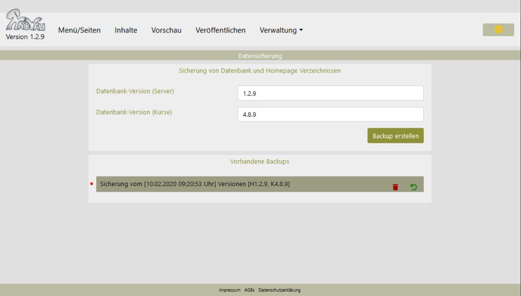 Im Menüpunkt Verwaltung->Datensicherung können Datensicherungen der kompletten Homepage erzeugen oder eine früher erzeugte Datensicherung wieder einspielen. Da die gesamte Homepage mit allen Ressourcen gesichert wird, sind diese Sicherungen oft sehr groß. Die maximale Anzahl der Sicherungen ist deshalb auf 5 begrenzt.