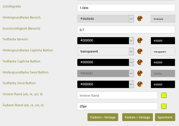 - Hintergrundfarbe, Schriftfarbe Captcha Button: Farben für den Captcha Button (Aufschrift: kann ich nicht lesen).