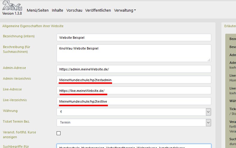 KnoWau kann das übergeordnete Verzeichnis MeineHundeschule nicht ermitteln und setzt daher das Basis-Verzeichnis hp2testadmin der eigenen "Web-Welt" ein.Hier muss man jetzt manuell nachhelfen und die übergeordneten Verzeichnisse manuell wie folgt ergänzen: