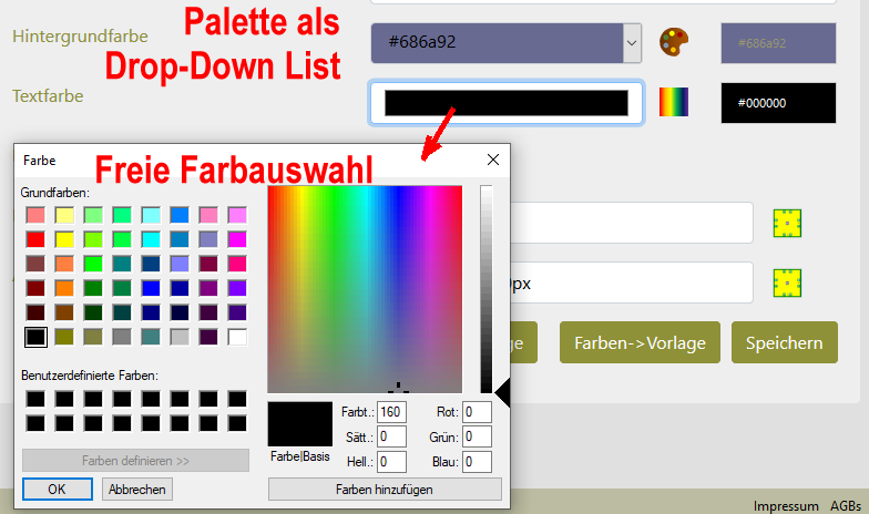 Farben spielen eine zentrale Rolle beim Design ihrer Homepage im Eingabe-Feld für Farbe stehen deshalb zwei Quellen zur Farbauswahl zur Verfügung: