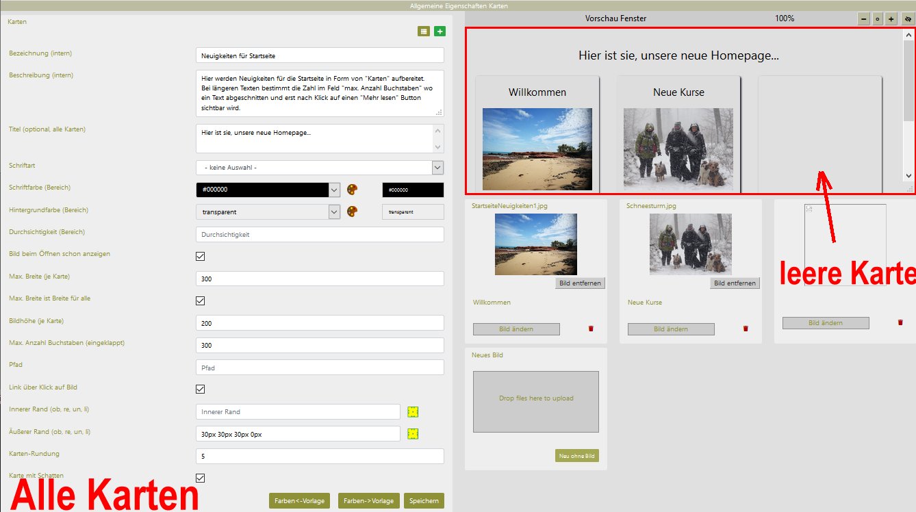 Karten sind rechteckige Elemente zu einer Gruppe zusammengefasst. Jedes Karten-Element besteht aus Text und Bild, beides optional - eine Karte ohne Text und Bild wird als leeres Element angezeigt.