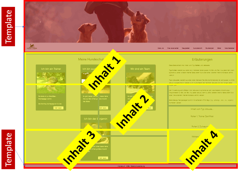 Jede Seite ist nach einem Schema aufgebaut, das aus einem Template übernommen wird. Templates bilden den Rahmen für die Seiten ihrer Homepage. Dieser Rahmen ist Bestandteil jeder Seite. Das ist ganz praktisch, dann brauchen sie die im Rahmen enthaltenen Inhalte nur einmal zu erstellen.