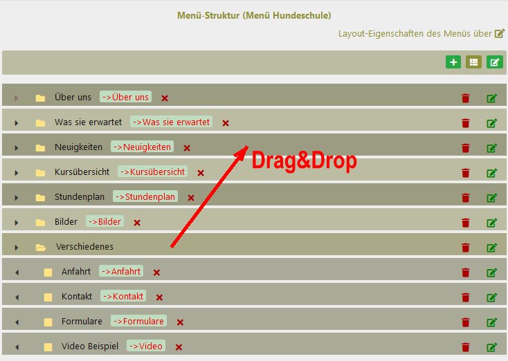 Änderung der Reihenfolge: per Drag&Drop, ziehen sie einen Menüpunkt zu dem Menüpunkt, hinter dem er eingefügt werden soll.
