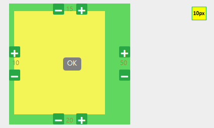 Über die Plus und Minus Symbole können die Abstände in der vier Dimensionen verändert werden. Durch Klick auf OK werden die Änderungen übernommen. Nach Klick auf OK im obigen Beispiel steht im Eingabefeld 15px 50px 20px 10px.