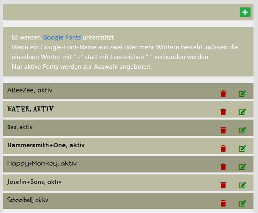 Als Schriftart können sämtliche Google Schriftarten gewählt werden. Man findet sie unter https://fonts.google.com/