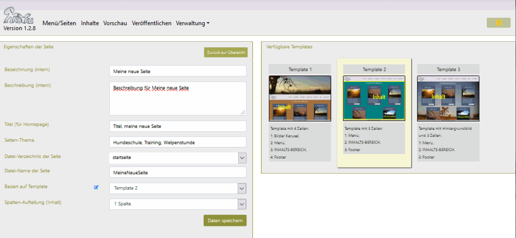 Jede Seite basiert auf einem Template, das den Rahmen für die Seite vorgibt. Für jede Seite kann dieses Template individuell festgelegt werden. Wir empfehlen aber, nicht zu viele verschiedene Templates innerhalb einer Homepage zu verwenden, sonst wirkt das Erscheinungsbild (Look & Feel) auf den Betrachter uneinheitlich.