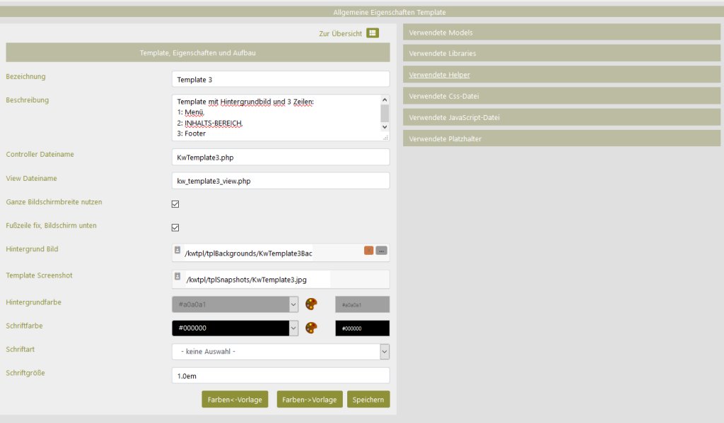 Jede Seite basiert auf einem Template, das den Rahmen für die Seite vorgibt. Wenn sie Templates anpassen, bedenken sie, dass diese für alle Seiten gelten, die das Template verwenden. Zur Anpassung eines Templates gelangt man, indem man im Menü Verwaltung->Templates (Vorlagen) das gewünschte Template zum bearbeiten