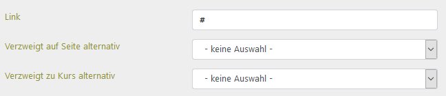 Verzweigungen zu Seiten und Kursen werden über die beiden Drop-Down Listen Verzweigt auf Seite alternativ und Verzweigt zu Kurs alternativ erstellt. Externe Links werden im Feld Link manuell eingegeben, z-.B. https://www.knowau.de . Das FEld ist nur editierbar, wenn in beiden alternativen Feldern die Auswahl - keine Auswahl - getroffen wurde.